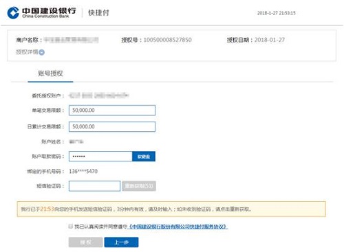 2.在建行快捷付开通页面,选择网银授权或账号授权,此处以账号授权为例,输入账号、手机号码后四位,点击下一步。