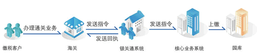 2.通关企业缴交关税:通关企业通过中国电子口岸办理网上支付税费业务,海关系统发送指令至代理银行,代理银行银关通业务系统自动完成税费划转,并将税费上缴国库。
